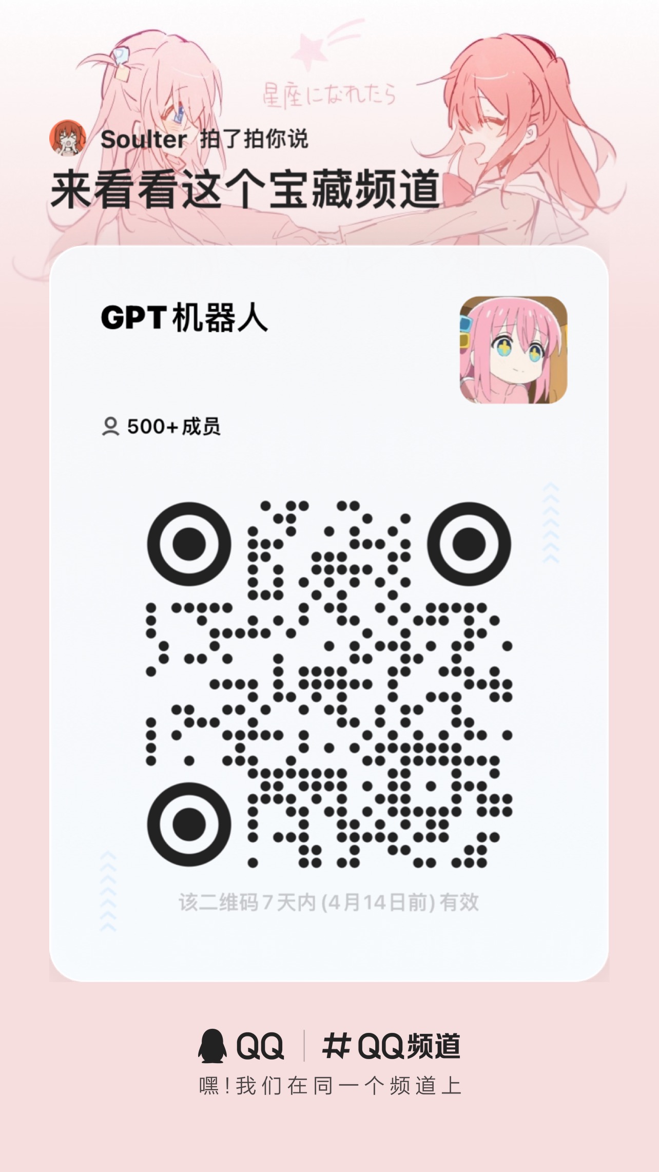 使用手机QQ扫码加入QQ频道(频道名: GPT机器人 | 频道号: x42d56aki2)